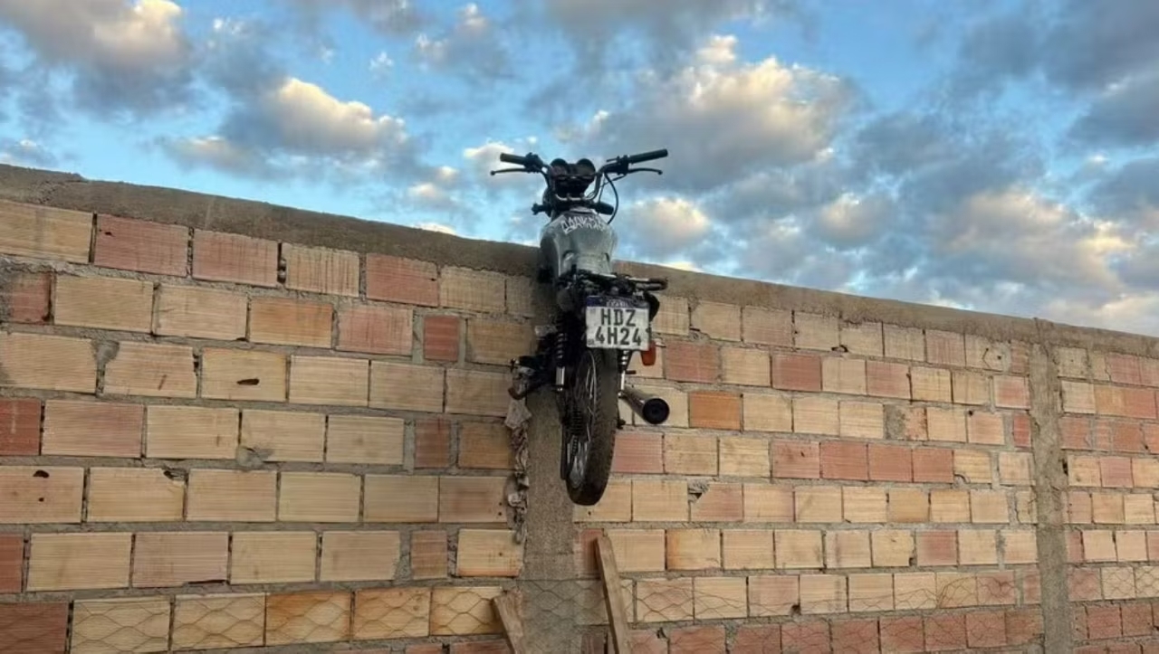 Uma motocicleta ficou pendurada no muro de três metros de altura do pátio credenciado do Detran, em Corinto, na Região Central de Minas Gerais. A ação criminosa, registrada na madrugada desta quinta-feira (7), envolveu seis adolescentes, com idades entre 15 e 17 anos, que foram detidos pela Polícia Militar (PMMG).