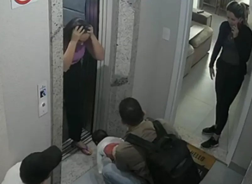As imagens mostram o momento em que o elevador chega e as mulheres entregam a bebê ao militar. A partir daí, o policial inicia a manobra de desobstrução respiratória enquanto outros moradores, assustados com a movimentação, saem de seus apartamentos para acompanhar a cena.