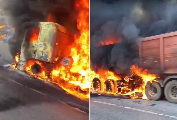 Um caminhão caçamba pegou fogo na BR-040, em Ribeirão das Neves, na Região Metropolitana de Belo Horizonte, no início da tarde desta terça-feira (30).