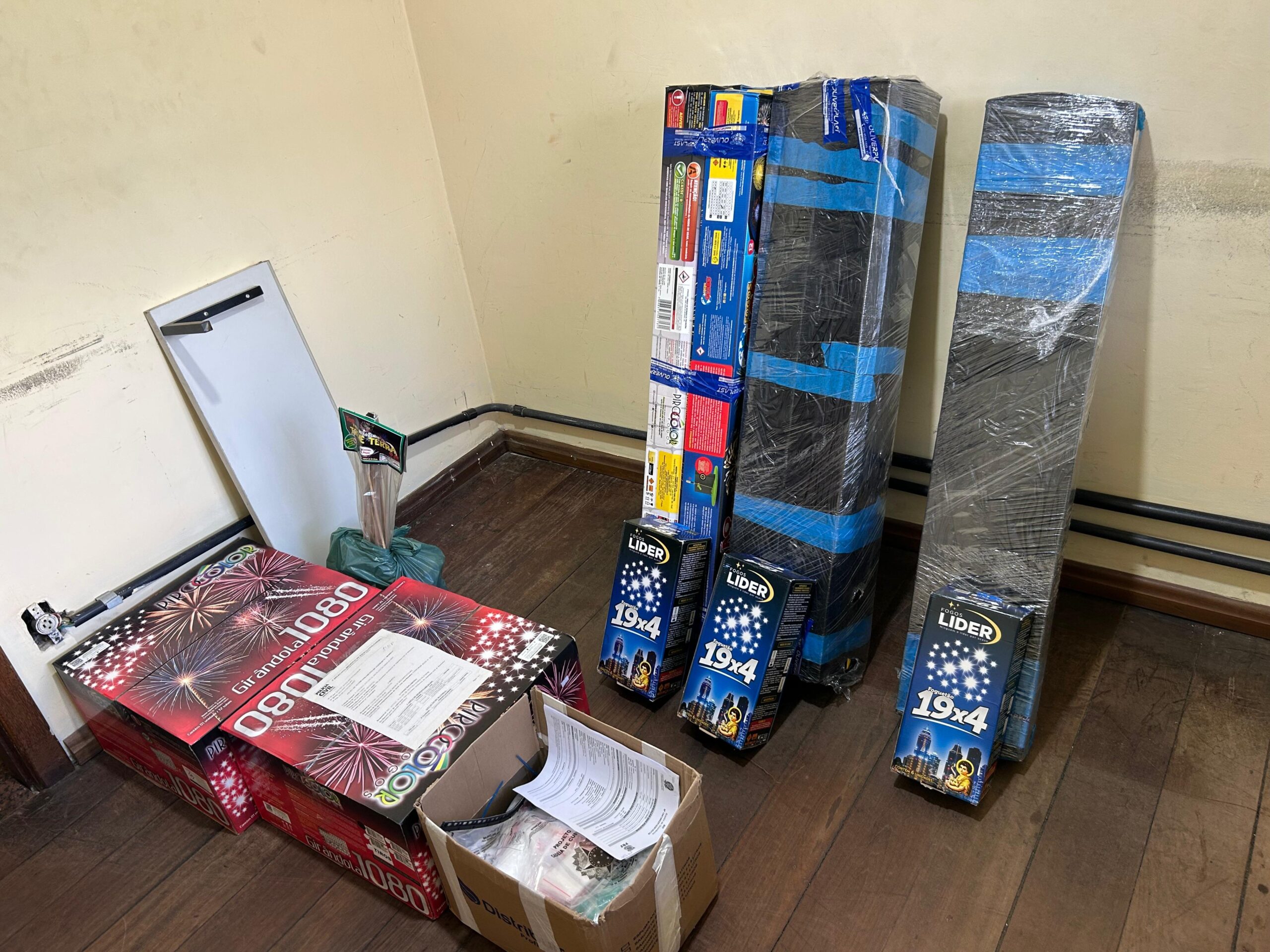 Durante a inspeção, foi encontrada uma caixa com fogos de artifício de alto potencial explosivo deixada em um canto de uma sala comum, sem ventilação, isolamento ou proteção adequada. Imagens registradas no local mostram ainda armamentos lacrados sendo armazenados de forma improvisada no mesmo ambiente.