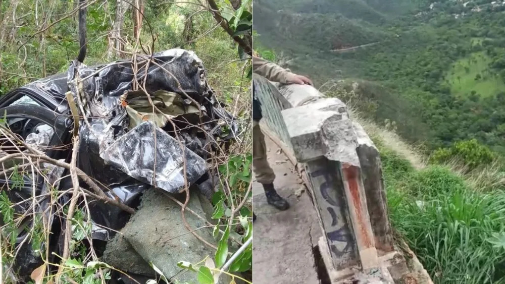Imagens registradas no local mostram a dimensão do desnível por onde o carro despencou. Antes da queda, o automóvel atingiu uma mureta de proteção de concreto e, em seguida, caiu em um trecho de mata.