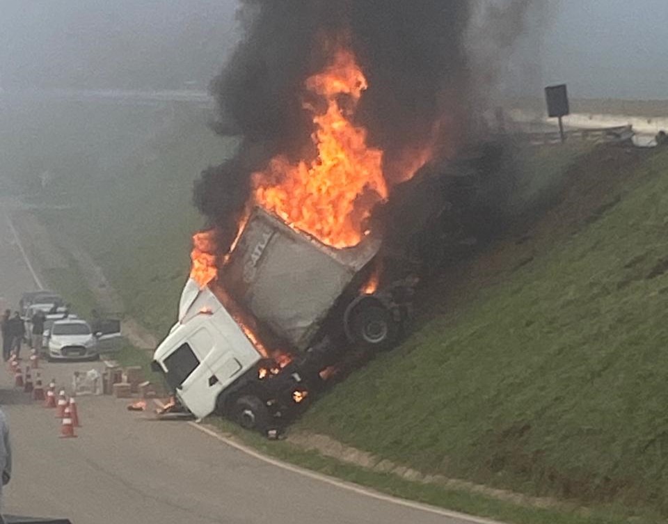 Uma carreta carregada com produtos da plataforma Mercado Livre tombou na BR-381, em Barão de Cocais, na Região Central de Minas Gerais. O acidente ocorreu na altura do km 386 na madrugada desta terça-feira (7) e, apesar do impacto, não houve registro de feridos.