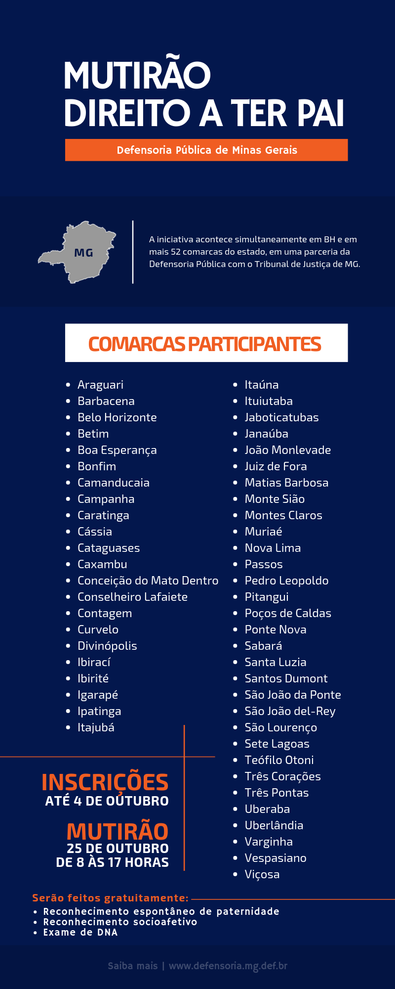 Para tentar reduzir esse volume, preencher lacunas e reconstruir histórias de vida, a Defensoria Pública de Minas Gerais (DPMG) está com inscrições abertas, até o dia 4 de outubro, para o “Mutirão Direito a Ter Pai”. Em parceria com o Tribunal de Justiça do Estado de Minas Gerais (TJMG), a iniciativa oferece, gratuitamente, os serviços de reconhecimento espontâneo de paternidade/maternidade, reconhecimento socioafetivo e exame de DNA.
