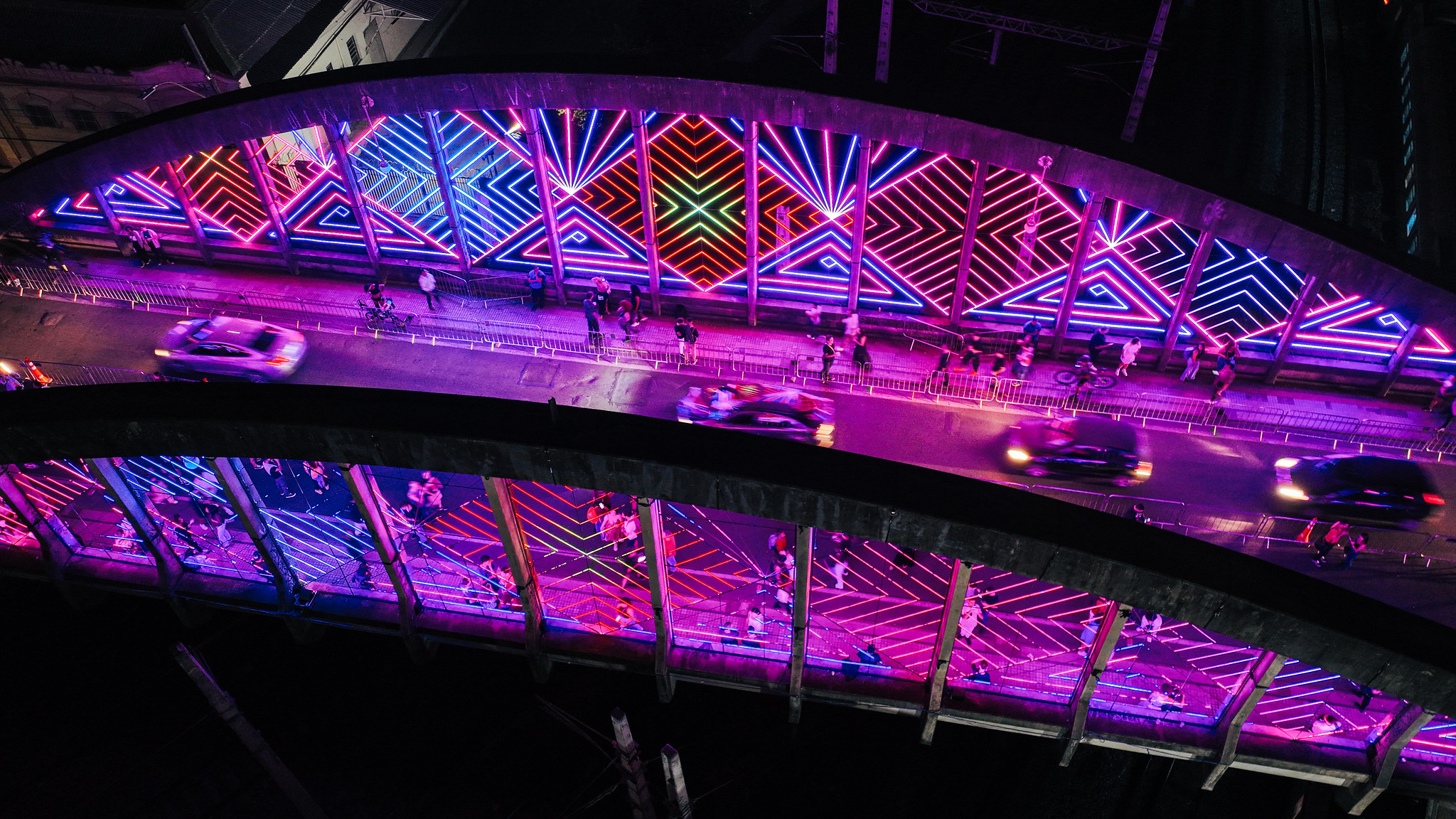 A programação reúne artistas locais e nacionais que transformam o espaço urbano em uma experiência imersiva de luz, arte e música.